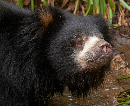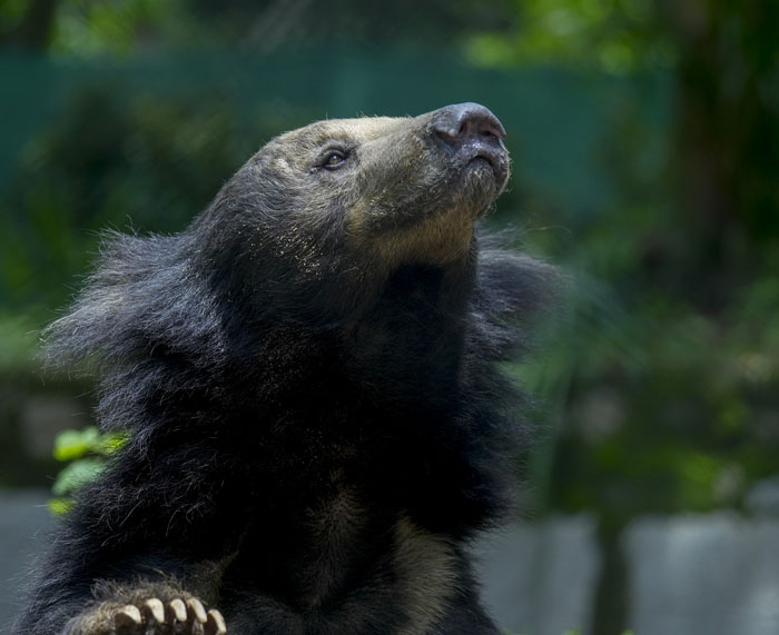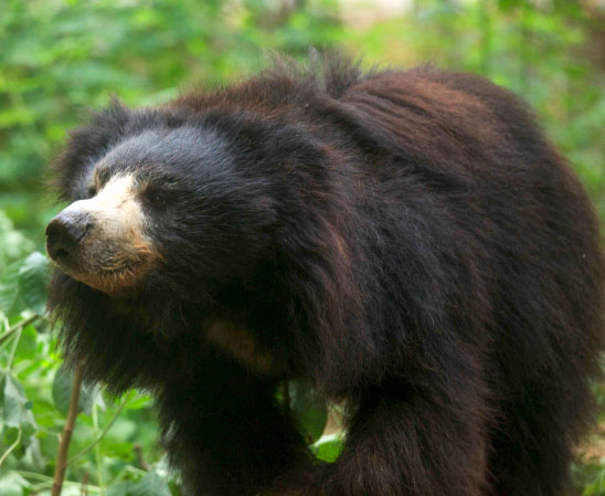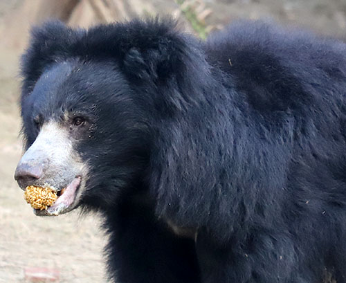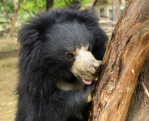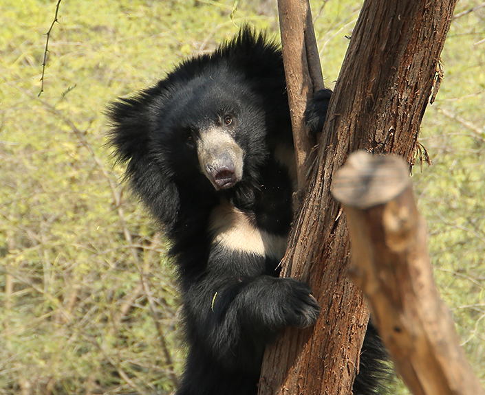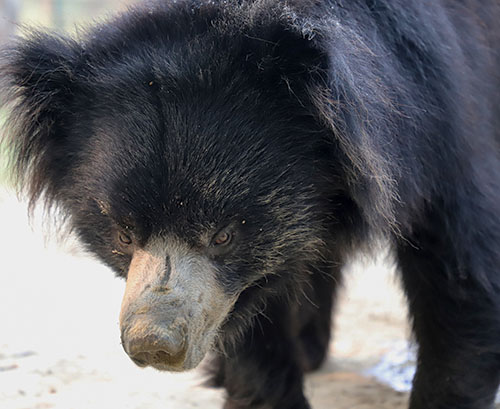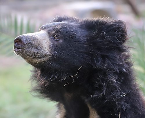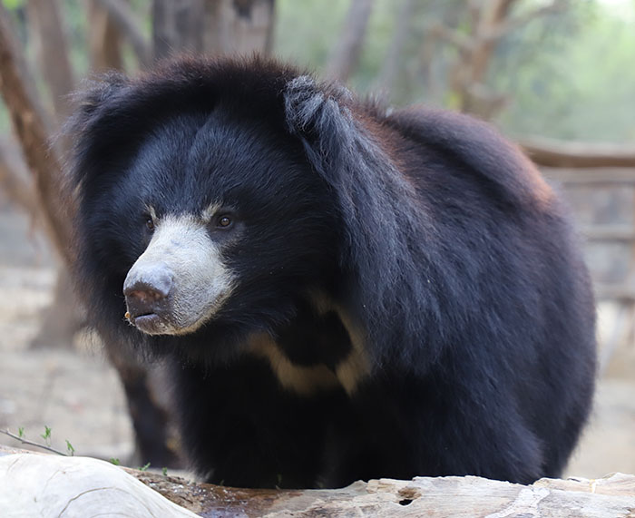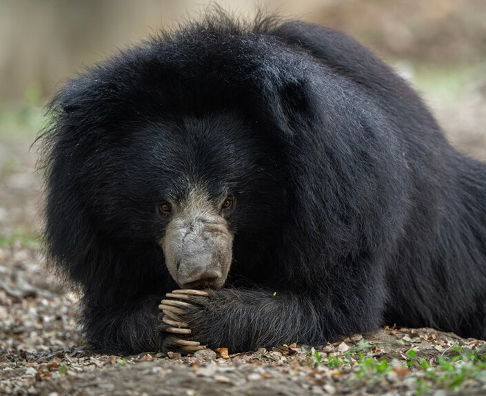 The Indian Sloth Bear (Melursus Ursinus) can easily be recognized by their shaggy black coat, long muzzle, protruding lip and a distinct white V-shaped patch on the chest. Their diet consists of fruits, berries, flowers, honeycombs, insect larvae and other insects. These bears have a particular proclivity to “vacuum” up termites and ants using their long snout.